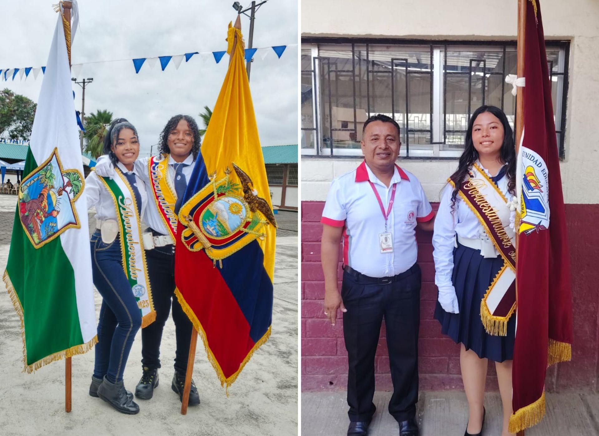 Bexanea Micolta De La Cruz, primera escolta del Pabellón Nacional; Paola Lastre Monrroy, abanderada del estandarte del colegio; Ashley Elizabeth Montaño Angulo, abanderada del Pabellón Nacional y Jareth Stefania Olmedo De La Cruz, abanderada provincial.