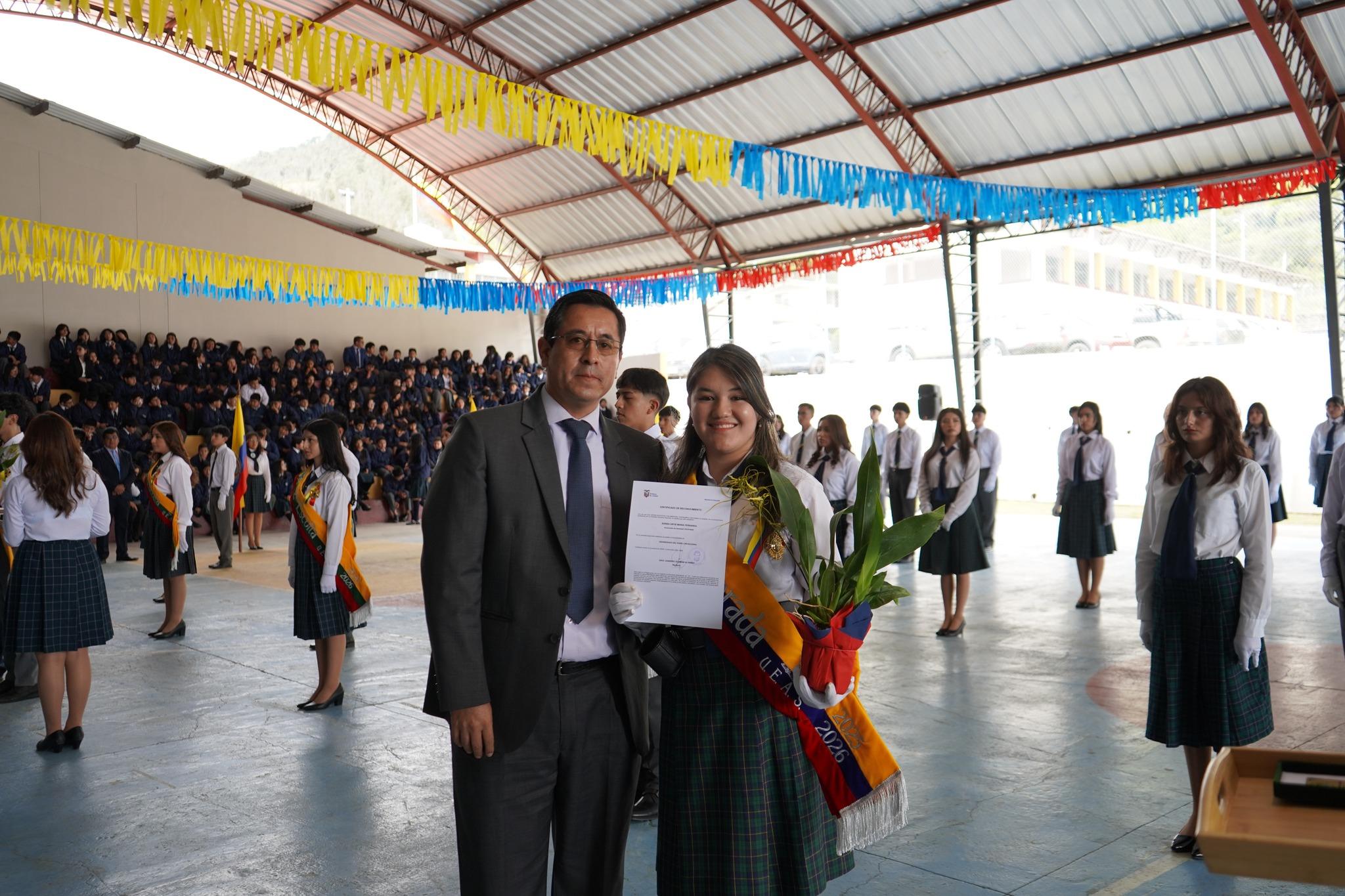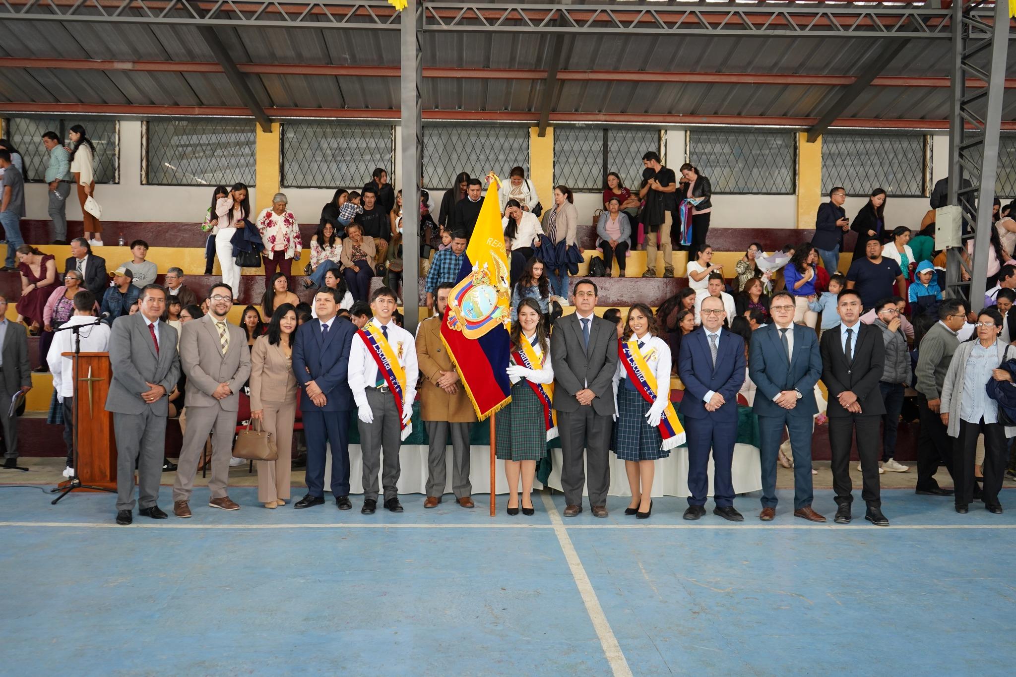 La ceremonia se desarrolló en dos momentos significativos. En la primera parte se proclamó a los nuevos abanderados y escoltas, destacando a María Fernanda Barba Ortiz como Abanderada del Pabellón Nacional, a Francis Chacón como Portaestandarte del Cantón Paute y a Idalia Torres como Portaestandarte del Pabellón Institucional. El acto incluyó la entrega simbólica de estandartes por parte de los exabanderados de la promoción 2024–2025, quienes cedieron con orgullo los símbolos patrios a sus sucesores, en un gesto de continuidad y reconocimiento al compromiso y dedicación escolar.