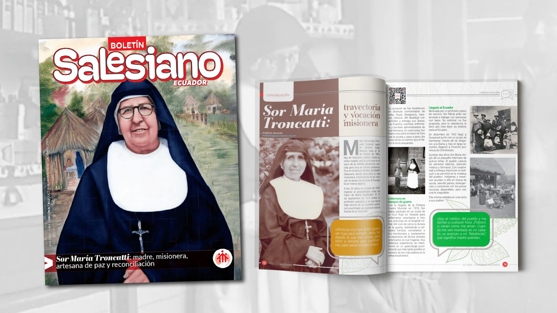 El número destaca, además, la profunda devoción popular a la santa en el Vicariato Apostólico de Méndez y Gualaquiza, cuna de su misión, y su influjo en la espiritualidad juvenil salesiana. El artículo «Santa María Troncatti: protectora, luz y guía del Voluntariado Juvenil Misionero» recuerda que fue proclamada patrona de los jóvenes misioneros del Ecuador, modelo de entrega y servicio generoso.