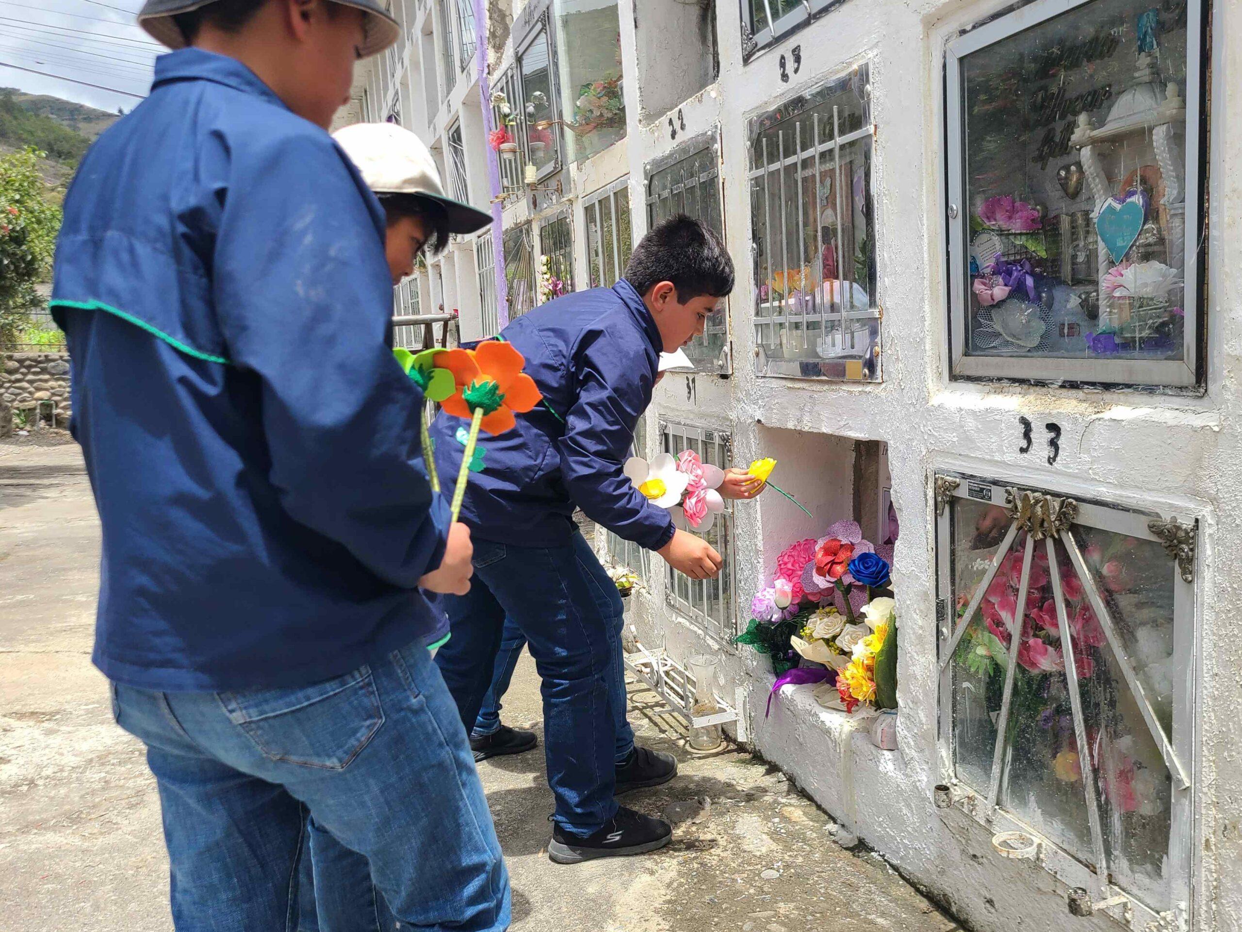 El día inició con la visita al Cementerio Municipal de Paute, un espacio donde los niños, acompañados por sus docentes y una delegación de padres de familia, realizaron un momento de oración por todos aquellos que descansan en la paz del Señor. Cada estudiante llevó consigo una rosa elaborada con sus propias manos y una vela, símbolos de amor y esperanza, que fueron colocadas con respeto en diversas tumbas.