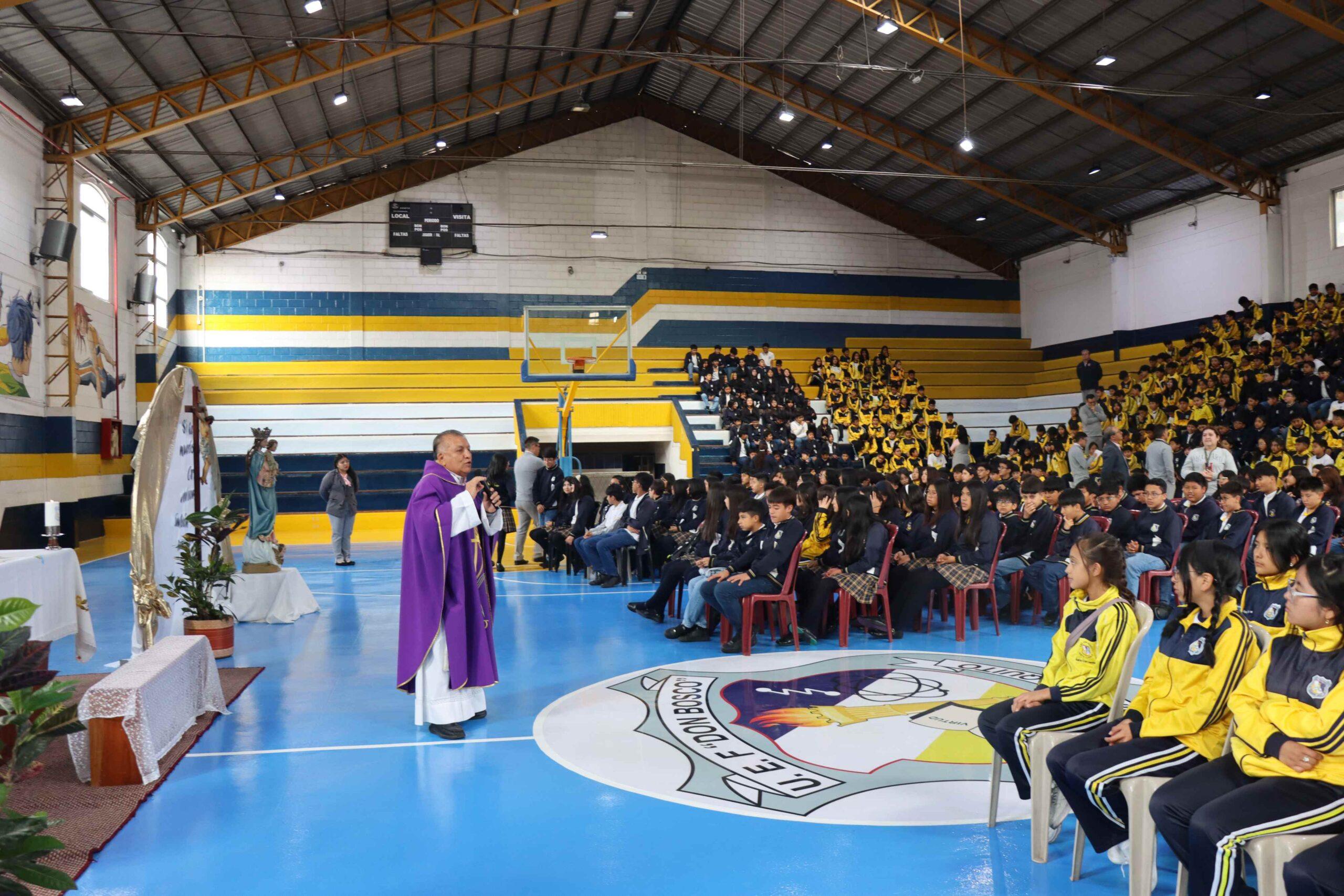 El miércoles 5 de noviembre de 2025, la comunidad educativa de la Unidad Educativa Fiscomisional Salesiana Don Bosco se unió en oración y recogimiento para conmemorar la solemnidad de Todos los Santos y recordar con amor a los fieles difuntos. La Eucaristía se celebró con profunda devoción en el coliseo institucional, y fue presidida por el P. Francisco Sánchez, SDB, quien dirigió una sentida reflexión hacia los estudiantes, docentes, personal administrativo y de apoyo, así como a las autoridades presentes.