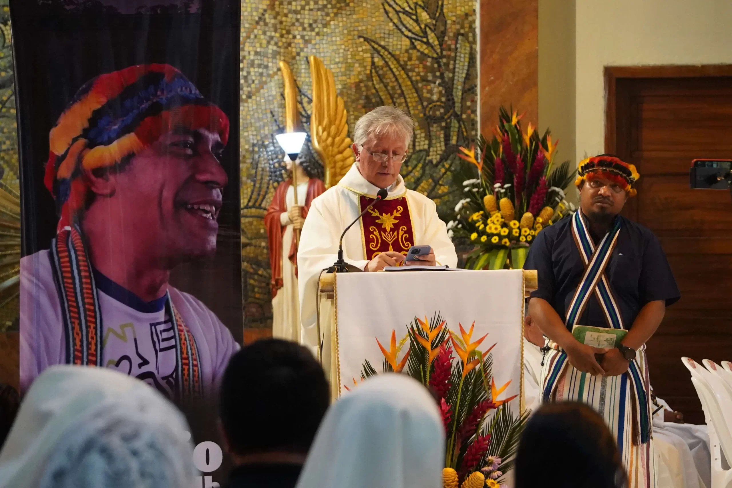 Un momento especialmente emotivo fue la participación de los jóvenes y familias de la Misión Salesiana de Wasakentsa, comunidad donde el padre Enio desarrolló su labor misionera desde el 2023. Ellos acompañaron la liturgia con cantos propios de la cultura achuar, como expresión de fe y reconocimiento al misionero que caminó junto a su pueblo.