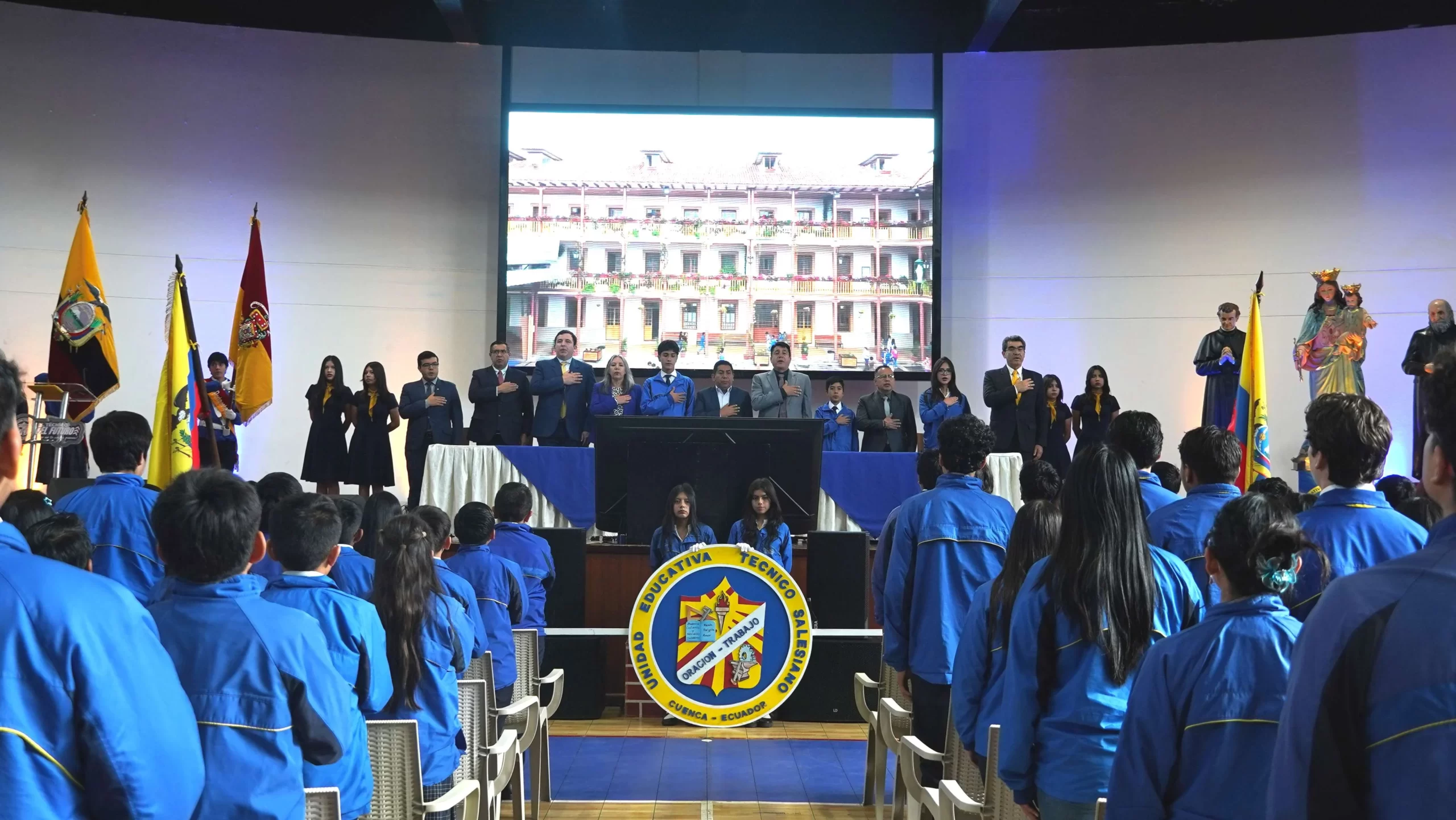 La Unidad Educativa Técnico Salesiano de Cuenca rindió homenaje al Día del Civismo Ecuatoriano con un programa especial desarrollado en el Coliseo Miguel Merchán, que contó con la participación de autoridades, docentes, estudiantes y padres de familia. La jornada inició con la entonación del Himno Nacional de la República del Ecuador, marcando el carácter solemne del acto y reafirmando el respeto por los símbolos patrios.