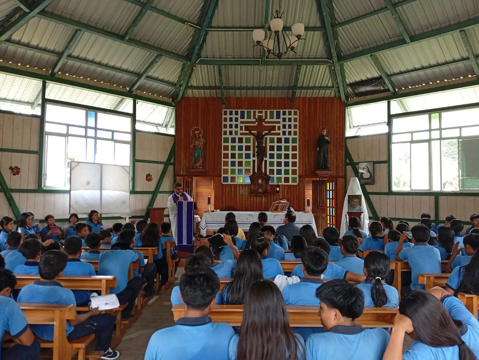 La Eucaristía fue vivida con profunda fe y recogimiento por toda la comunidad educativa: estudiantes, docentes y padres de familia. La celebración fue presidida por el P. Fabián Lozada, rector de la institución, y concelebrada por el P. Anton Odrobiñak, en un ambiente de oración y gratitud por la vida y misión de este insigne misionero salesiano.