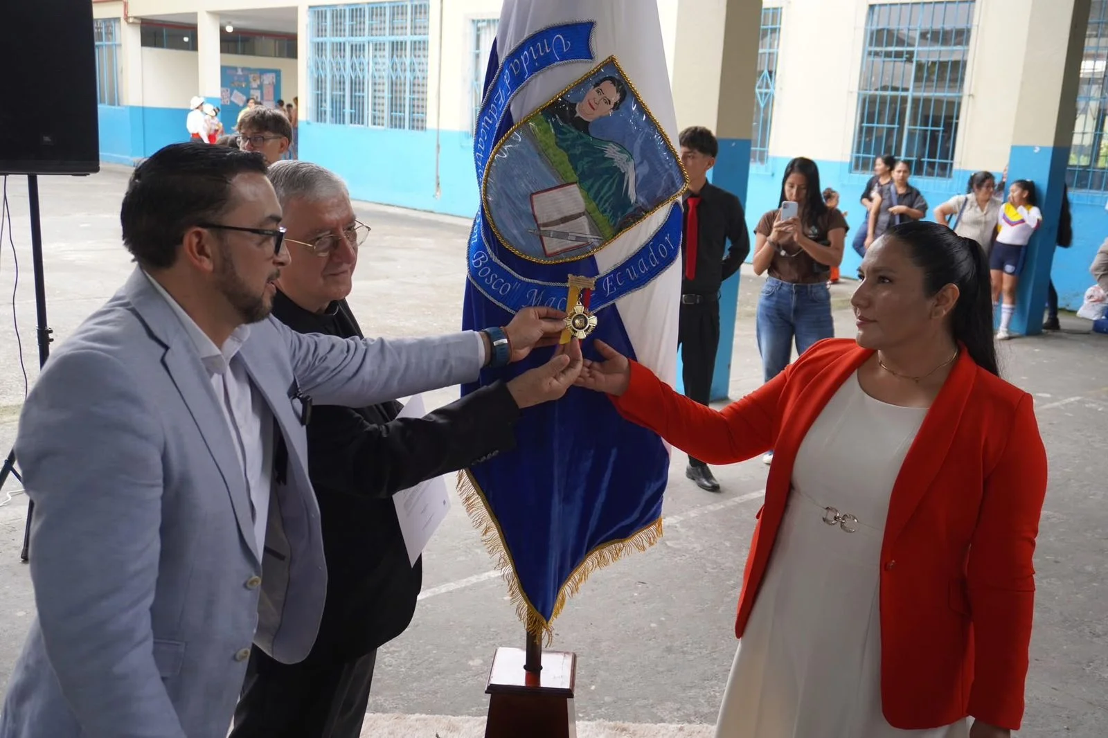 El acto se desarrolló mediante un programa solemne que incluyó la interpretación del Himno Nacional, palabras de bienvenida institucionales y la reseña histórica a cargo de la rectora, Magíster María de Lourdes Mera, quien evocó los principales hitos y el legado formativo de estos 75 años, destacando el sentido de comunidad, la identidad salesiana y la misión de educar desde la fe y la razón al servicio de la sociedad.