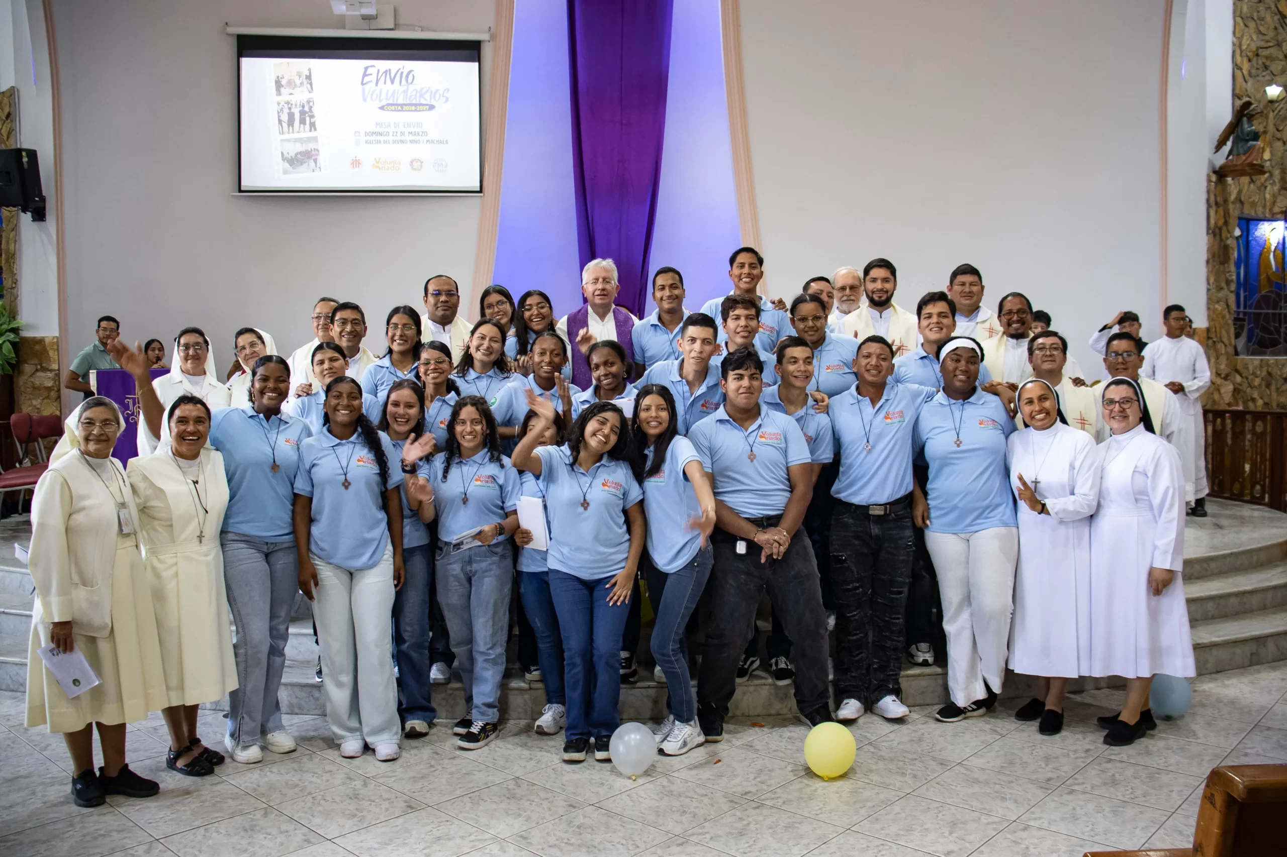 El domingo 23 de enero, en la Iglesia del Divino Niño de Machala, se celebró la Eucaristía del Envío de Voluntarios Costa 2026-2027 presidida por el P. Marcelo Farfán, inspector de los Salesianos en el Ecuador y concelebrada por salesianos de diferentes casas del Ecuador. En esta ocasión, 26 jóvenes valientes recibieron sus cartas de obediencia y dieron inicio a una misión de servicio que se renueva, año tras año, con su sí generoso al llamado de Dios.