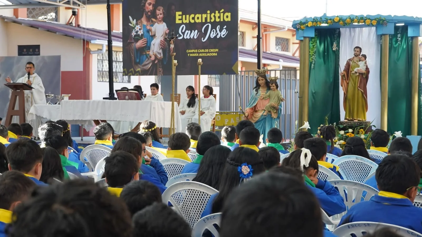 La Unidad Educativa Técnico Salesiano realizó la celebración de la Eucaristía en honor a San José en el Campus Carlos Crespi, con la participación de estudiantes de cuarto de Básica, padres de familia, docentes y autoridades. La misa fue presidida por el P. David de la Cruz, SDB, quien acompañó este espacio de encuentro y reflexión para la comunidad educativa.
