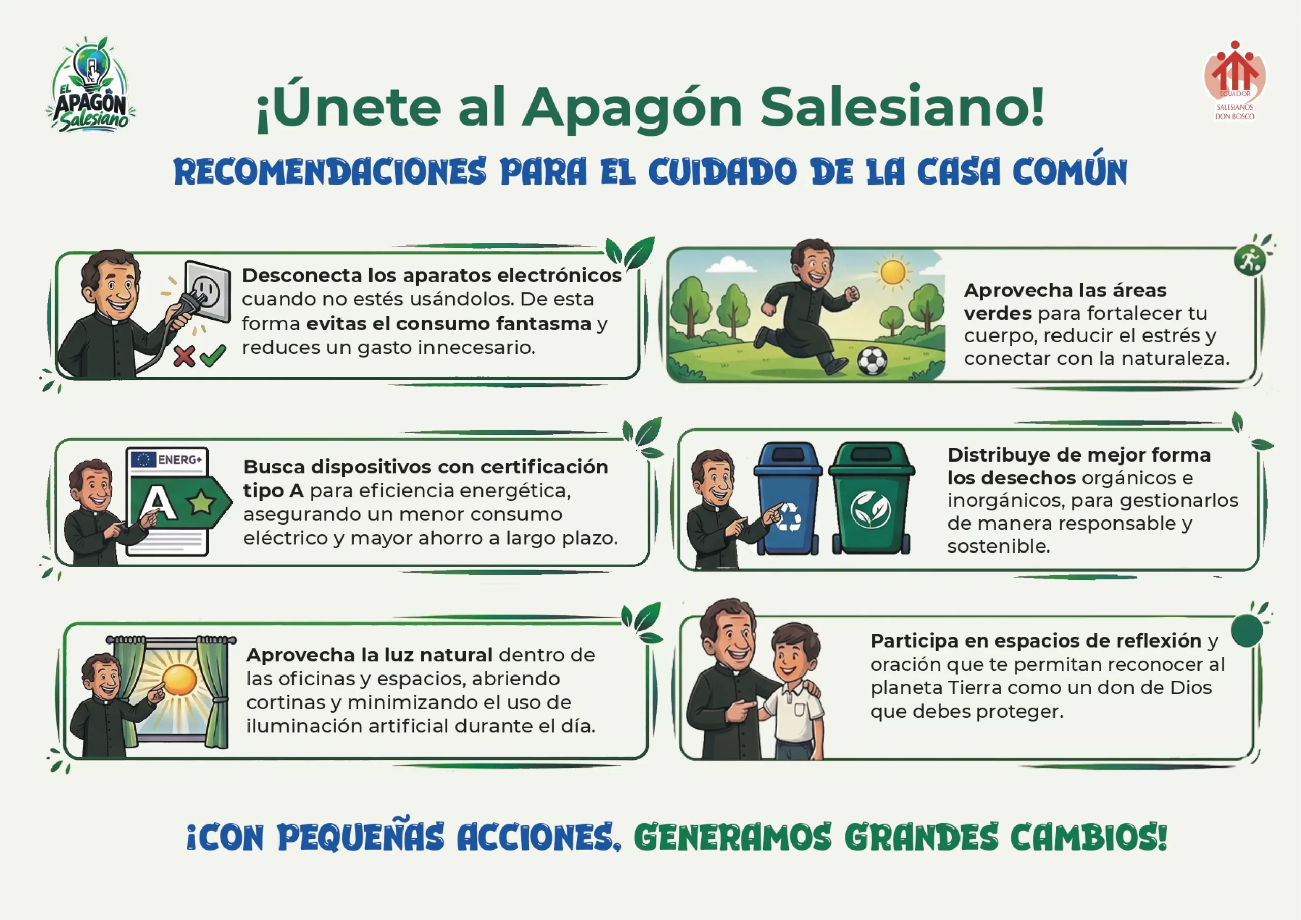 Se invita a aplicar estas prácticas en los diferentes ambientes y sectores de la Inspectoría, recordando que no se trata de un compromiso de un solo día, sino de una forma de vida orientada al cuidado permanente del planeta. ¡Súmate al apagón y enciende tu conciencia!